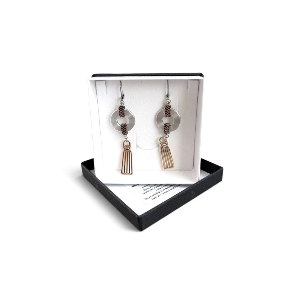 Autorské duralové náušnice v kombinaci matného kovu a hnědo-měděných korálků působí výrazně, ale velmi elegantně.