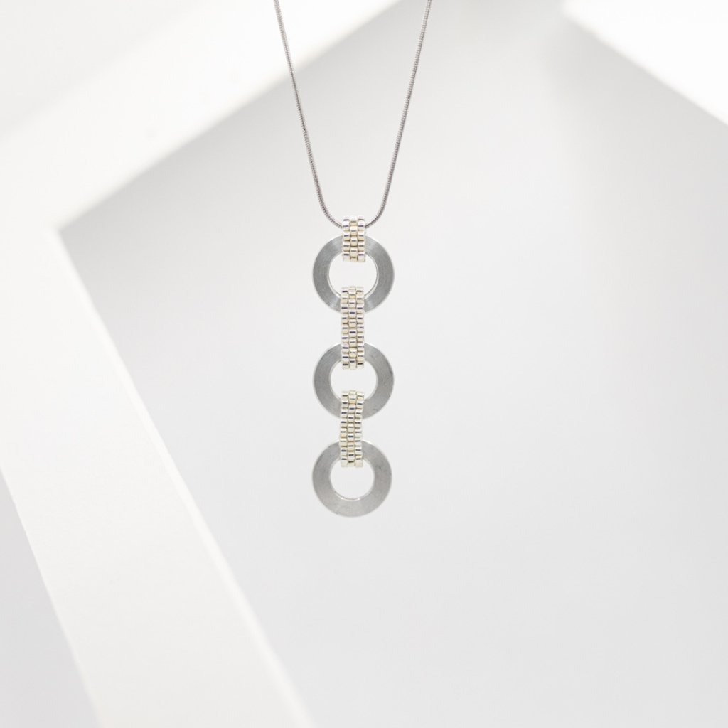 Matné duralové kroužky doplňují stříbrné korálky, které mu dodávají jemný lesk a noblesu