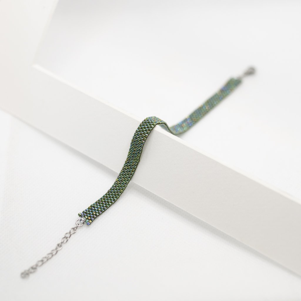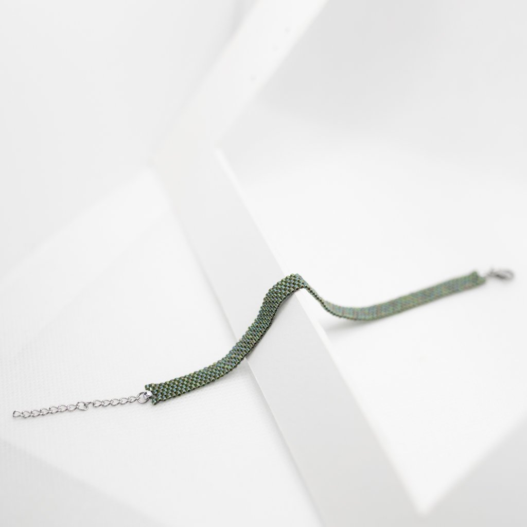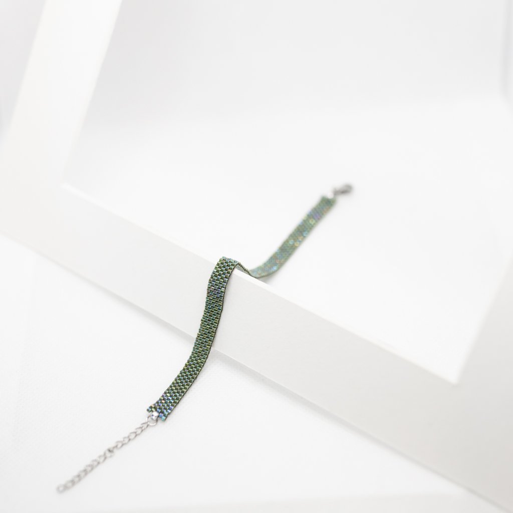 Green Touch je subtilní, ručně šitý náramek ze skleněných korálků olivově zelené barvy – decentní, ale nepřehlédnutelný.