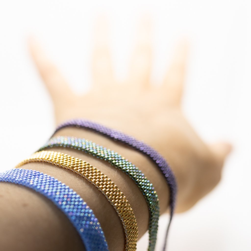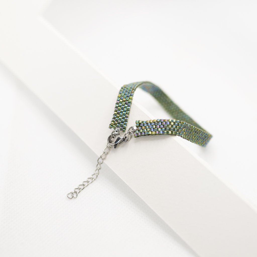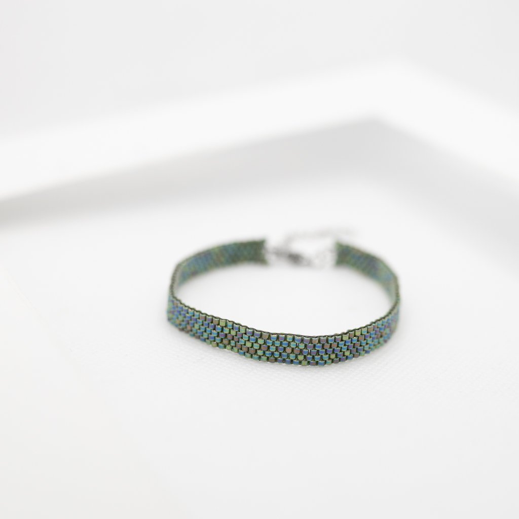 Green Touch je subtilní, ručně šitý náramek ze skleněných korálků olivově zelené barvy – decentní, ale nepřehlédnutelný.