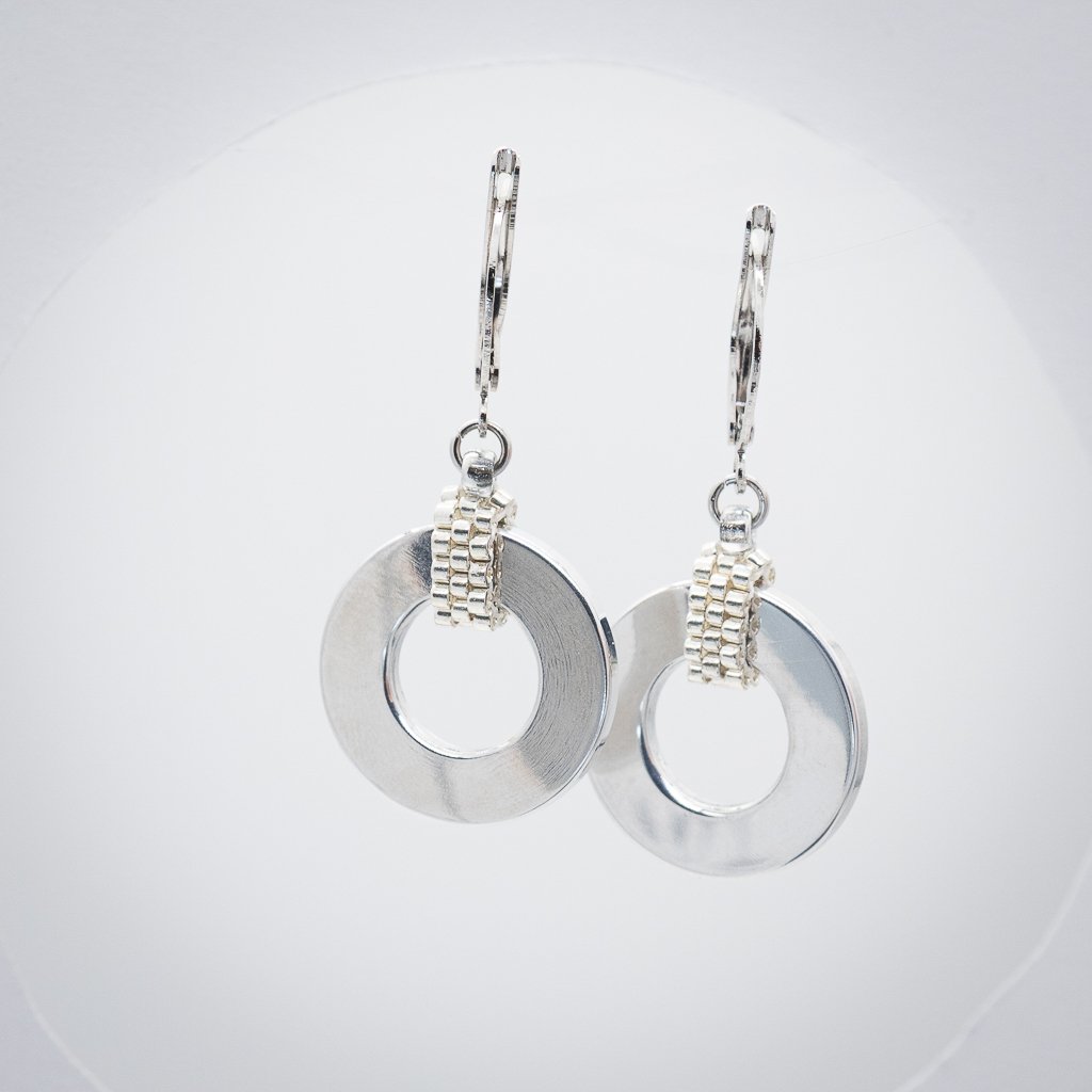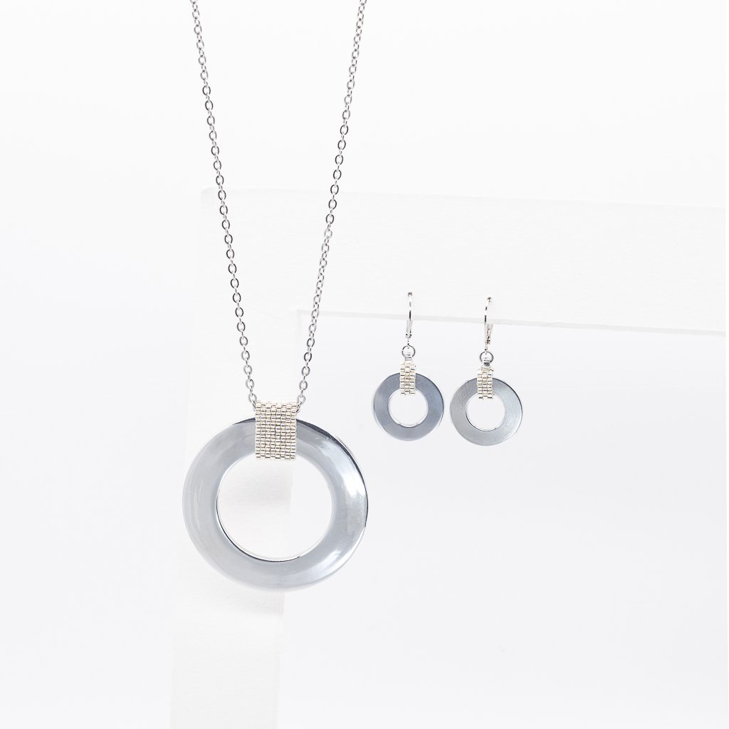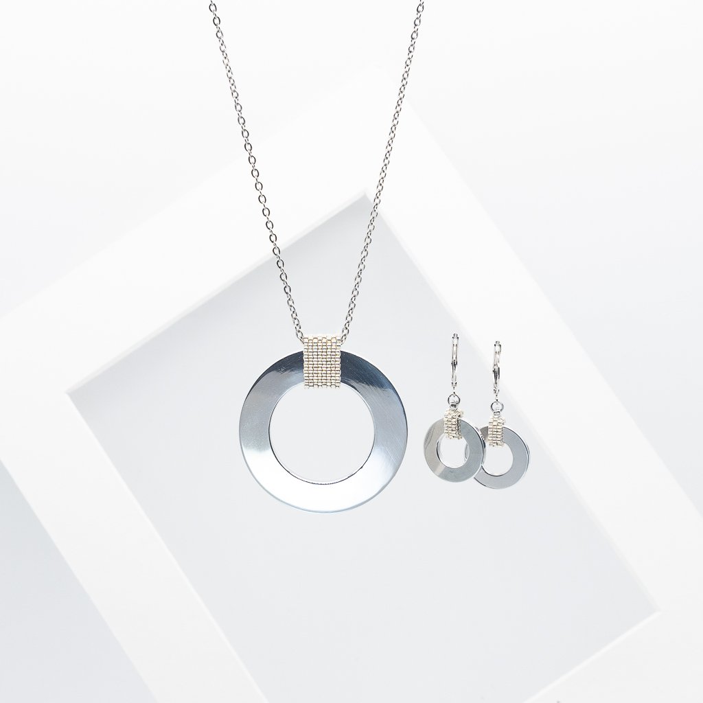 Autorský set náhrdelníku a náušnic z leštěného duralu a korálků ve stříbrné barvě